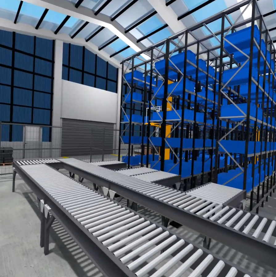 La Realidad Virtual permite entrenar equipos en escenarios inmersivos de almacén de muy diferente tipología, replicando flujos complejos y situaciones de emergencia sin interrumpir la operativa real. Este enfoque reduce errores, mejora la seguridad y acelera el aprendizaje al practicar procedimientos en entornos realistas antes de su ejecución en planta. En este blog hablaremos concretamente del escenario de realidad virtual desarrollado para la formación de operarios en estaciones de picking en miniload. Qué es el picking en miniload El picking en miniload es una operativa goods‑to‑person en la que el sistema automático acerca cajas o bandejas a una estación fija para que el operario extraiga las unidades requeridas, mientras el SGA coordina en tiempo real los movimientos y la secuencia de trabajo mediante una interfaz HMI en el puesto. A diferencia del person‑to‑goods , el transelevador localiza y extrae el contenedor en estanterías de gran altura, lo deposita en el transportador y lo envía a la cabecera de picking , reduciendo desplazamientos del operario y aumentando velocidad y precisión en la preparación de pedidos. En un miniload se integran estanterías de alta densidad, transelevadores para cajas o bandejas, transportadores y software de control, logrando gran aprovechamiento de espacio y flujo continuo de contenedores hacia las estaciones de trabajo. El proceso típico en la cabecera consiste en recibir el contenedor, seguir las indicaciones de cantidades en pantalla, confirmar la operación y devolver automáticamente el contenedor al rack, todo ello con trazabilidad gestionada por el SGA