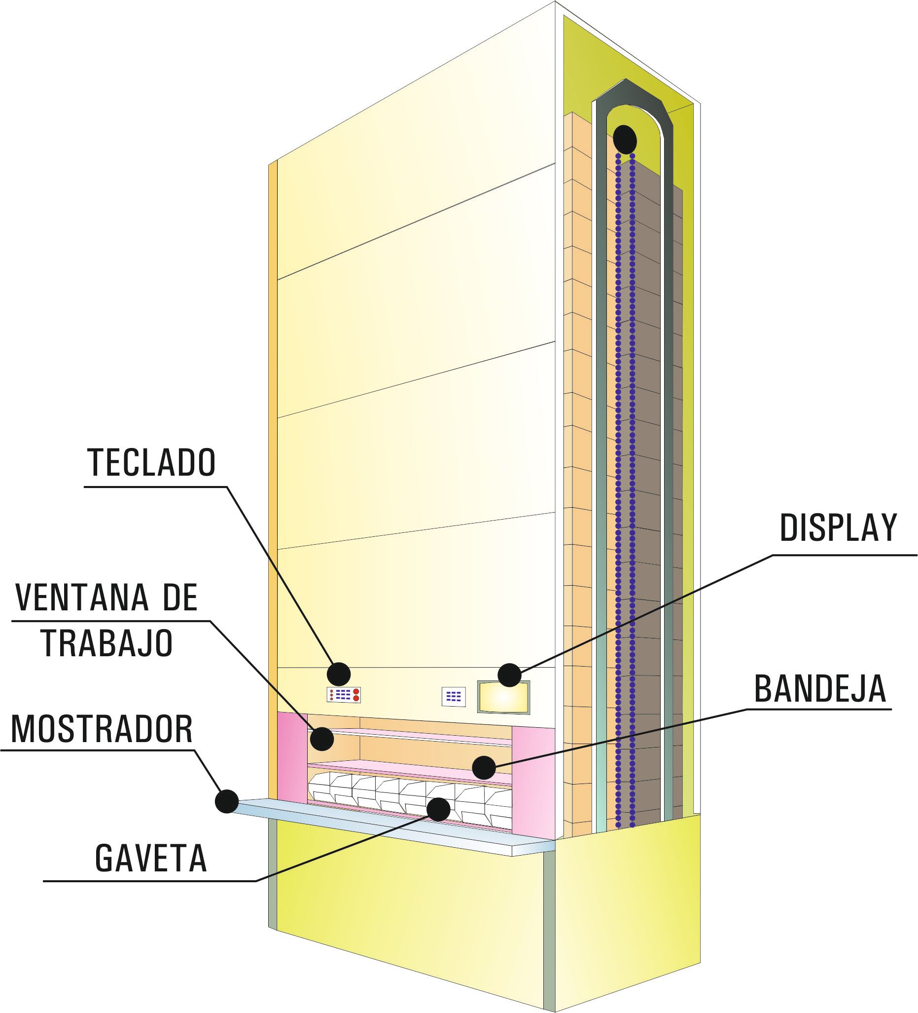 Este tipo de estantería rotativa automática permite instalaciones en alturas de hasta 10 metros, y se puede hacer de forma independiente, con una única abertura de servicio para recogida del producto en su base inferior, o bien conectada a varias plantas a distintos niveles con varias aberturas de servicio.