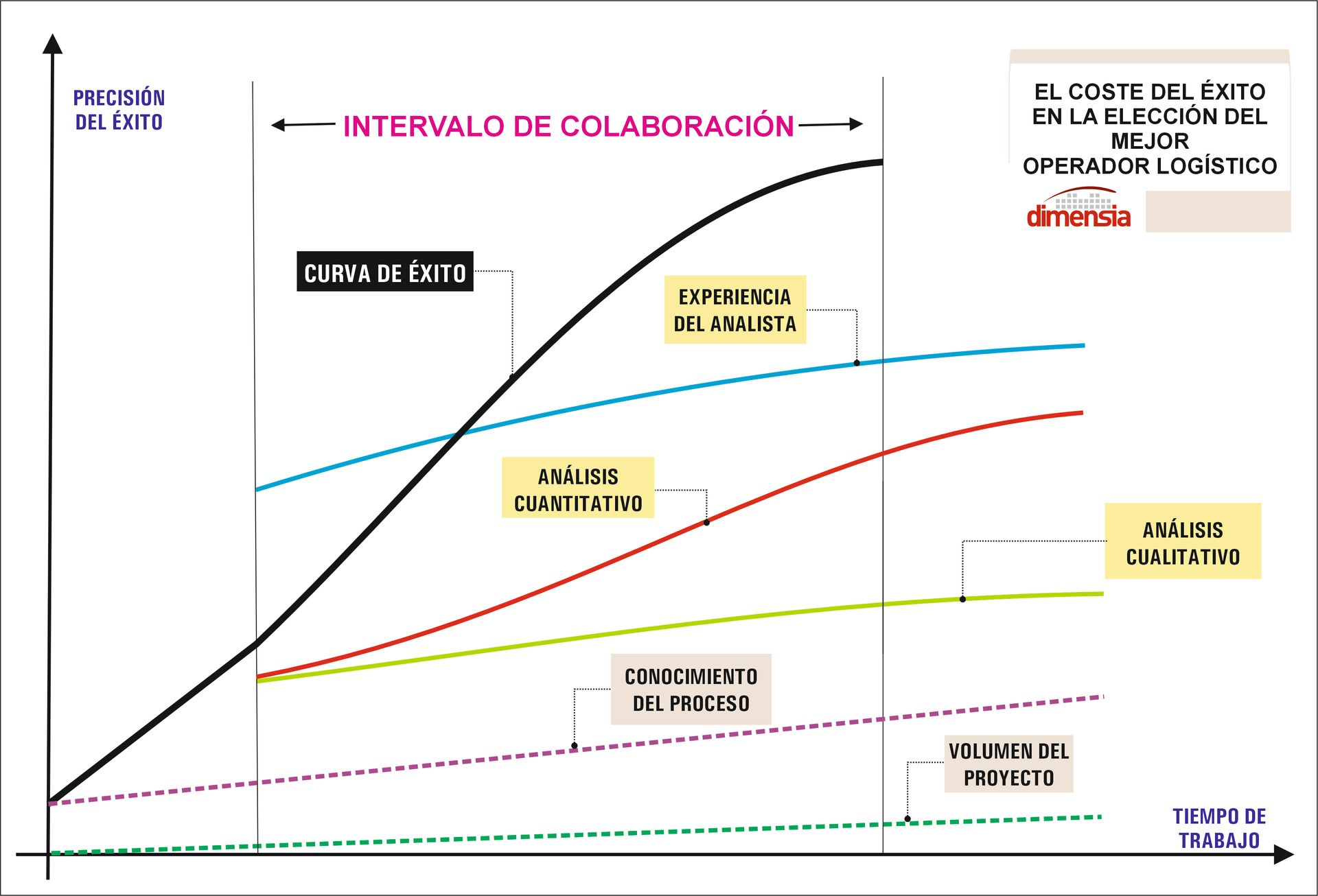 En el gráfico inferior hemos querido ofrecer una representación conceptual de lo que denominamos “curva de éxito” en la elección de un Operador Logístico, la cual consigue su punto óptimo cuando al conocimiento propio de la compañía del proceso y volumen del proyecto, sumamos un intervalo de colaboración con un externo, que aporte experiencia y un elevado y cualificado grado de análisis, tanto cualitativo como cuantitativo.