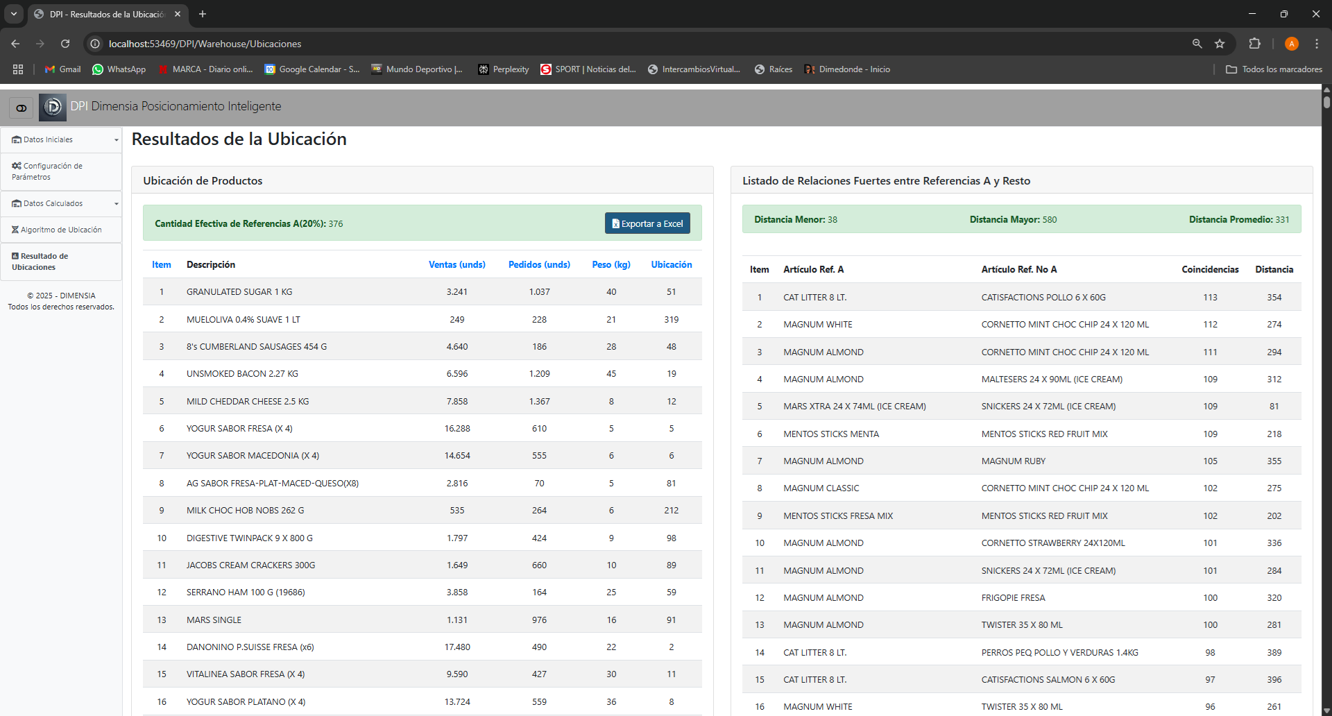 DPI tiene la capacidad de detectar correlaciones entre artículos, es decir, identifica qué productos suelen pedirse juntos, independientemente de su volumen individual de ventas. Así, un artículo de baja rotación (tipo C), si aparece de forma recurrente en pedidos junto a artículos A, será tenido en cuenta para una ubicación estratégica cercana. Esto permite un diseño logístico mucho más eficiente y ajustado a la realidad operativa del almacén.