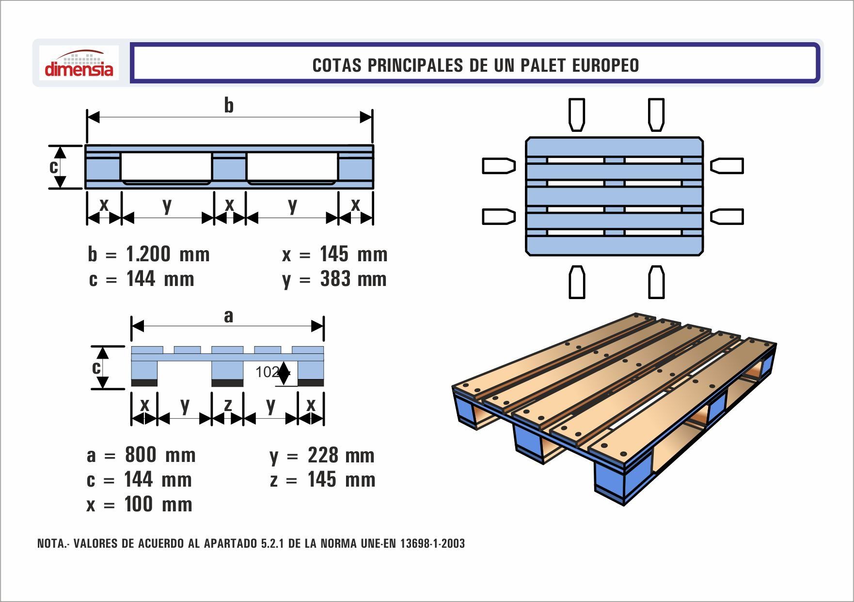 La equivalencia europea es la UNE-EN 13382:2002 que sustituye a la Norma UNE 58005 de marzo de 1993 y que determina una serie de cotas para los palets que básicamente son las siguientes:
